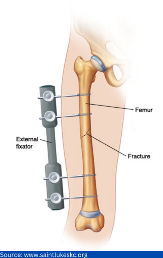 External fixation is not typically a permanent treatment for broken femurs. It is usually applied if the patient has several injuries and is not healthy enough to undergo a more extended surgery at the time.